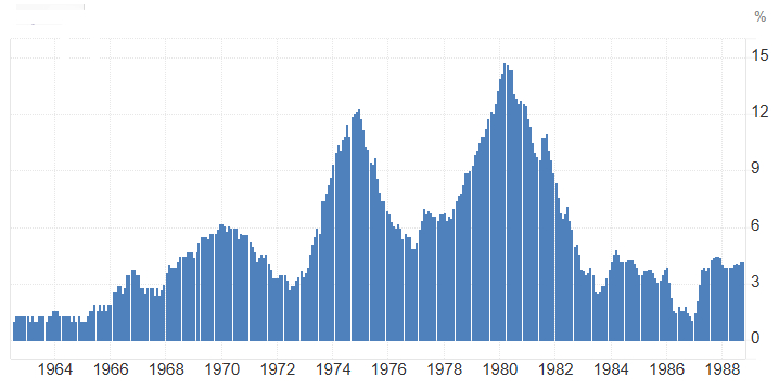 The last major case of severe inflation in the developed world happened around the 1970s. In the US, as evident from the figure below, it lasted twenty years and had three episodes of rise and fall, with each successive episode having a steeper rise and fall than its predecessor. Each episode lasted for four to five years.